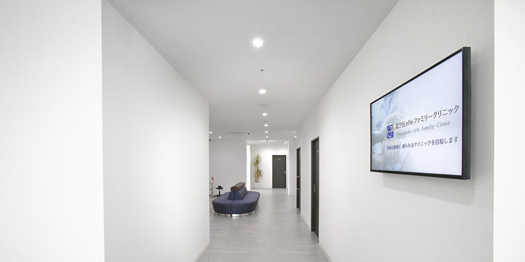 中待合室へと続く廊下は、車椅子ですれ違っても、ぶつからない広さをとりました。またモニターをご用意し、患者様のお役に立てる情報を随時流しております。